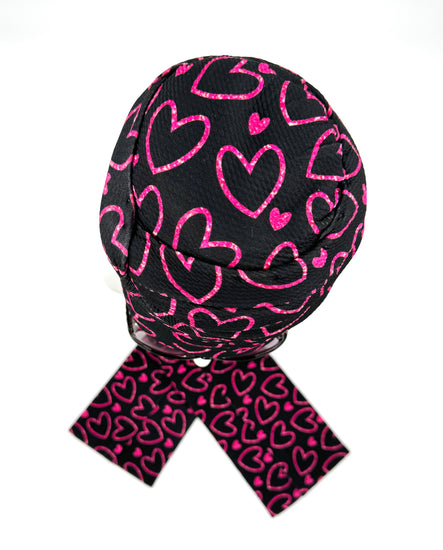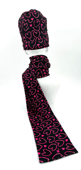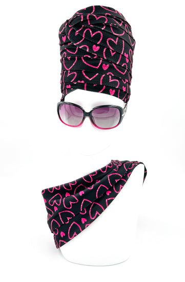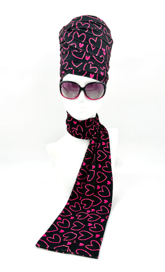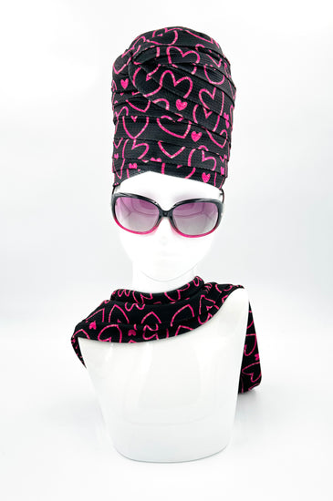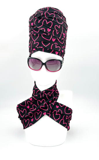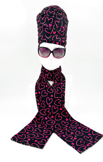 011-Blk & Pink Heart Crown & scarf set w/silky satin inner lining. One of a kind. Just what you've been waiting for. Discover the perfect Couture Crown for your everyday attire wear it proudly. Winter & Fall Season.