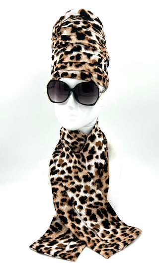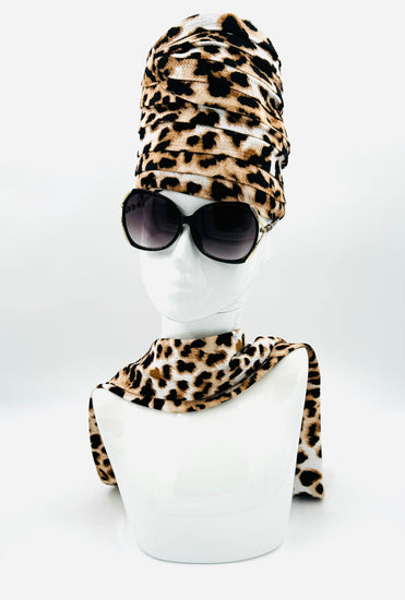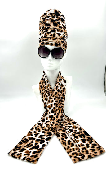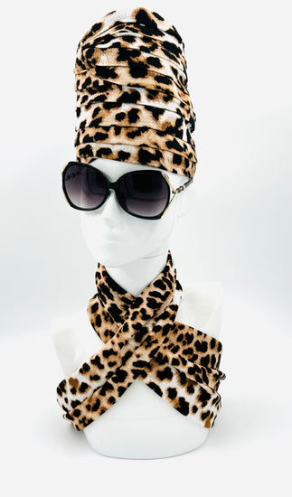 018-Cheetah Blk & Brown Crown & scarf set w/silky satin inner lining. One of a kind. Just what you've been waiting for. Discover the perfect Couture Crown for your everyday attire wear it proudly. Winter, & Fall Season.