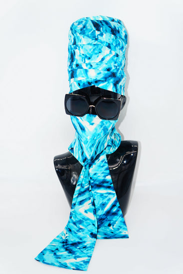025-Abstract Turquoise & Teal Print. Crown & scarf set w/silky satin inner lining. 2-piece fashion set. One of a kind. Will not be duplicated. Just what you've been waiting for. Discover the perfect Couture Crown for your everyday attire wear it proudly. Winter, Fall & Spring Season.